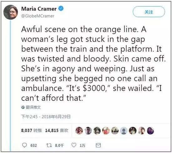 就在前几日,美国一女子的腿被卡在地铁列车与站台的缝隙中,腿部扭曲流血,皮肤被撕裂,在巨大的痛苦中,她竟然哭着恳求路人不要叫救护车,因为那要花费3000美金。