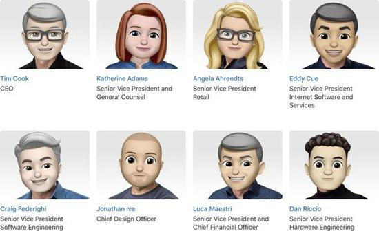 苹果还在今天准备了个彩蛋:在其官网管理层介绍页面上,CEO蒂姆·库克(Tim Cook)、零售业务负责人安吉拉·阿伦茨(Angela Ahrendts)、设计负责人乔尼·艾维(Jony Ive),以及艾迪·库伊(Eddy Cue)、克雷格·费德里西(Craig Federighi)、卢卡·梅斯特里(Luca Maestri)和菲尔·席勒(Phil Schiller)等高管都有了自己的Emoji卡通形象。