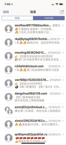 与小静类似,用户尹女士也经常收到用邮件地址发来的各类垃圾信息,包括赌博、高仿商品、假证等。“我同时拥有两个手机,一个安卓系统和一个苹果系统。很奇怪,苹果系统就经常收到这类信息,安卓的就没有。这是为什么呢?”