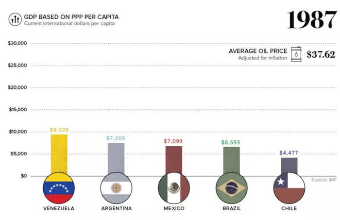 1987年,委内瑞拉是南美GDP总量最大的国家。但是40年之后,风水轮流转了。