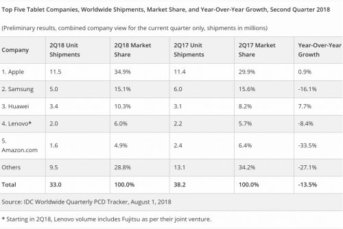 据国外媒体VentureBeat报道,市场统计机构IDC发布了全球平板电脑市场最新的统计数据,数据显示,2018年第二季度,全球平板电脑出货量同比下降13.5%,至此全球平板电脑出货量已经连续15个季度同比下滑。