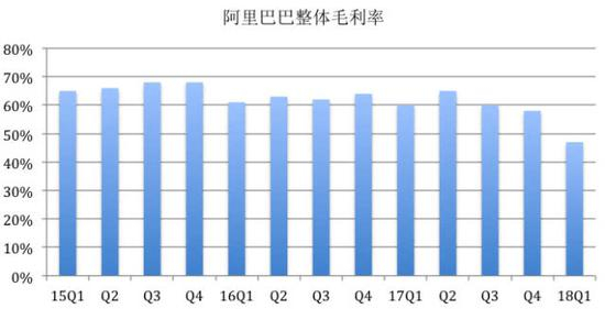 阿里今年一季度的整体毛利率是47%,去年四季度是58%,均低于它的平均水平。这正是阿里大举布局线下的阶段,高投入拉低了毛利率。财报对此解读为,源于对新零售、菜鸟、Lazada的投入,以及为扩大用户基数、改善用户体验所做的支出。