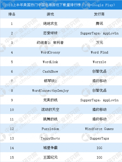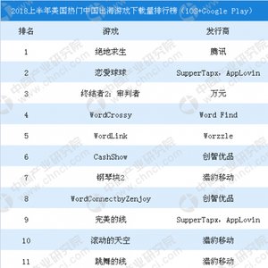 根据AppAnnie、中商产业研究院整理的数据来看,2018上半年美国热门中国出海游戏下载量排行榜,排名前十的游戏中网易和腾讯仅各占一款,中小厂商出海前景可期。