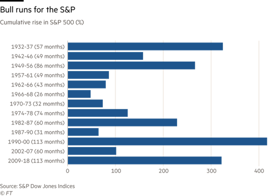 据英国金融时报报道,随着本周一美股连续第三个交易日走高,华尔街即将迎接史上最漫长的牛市纪录。