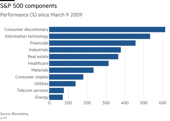 此轮美股牛市的起点开始于2009年3月9日,在经历了金融危机最严重时刻后,标普500触及666.79点的盘中低位,此后该指数一路反弹。截至今年8月,标普500期间涨幅超过320%,道指涨了近3倍,纳指涨幅则高达504%。
