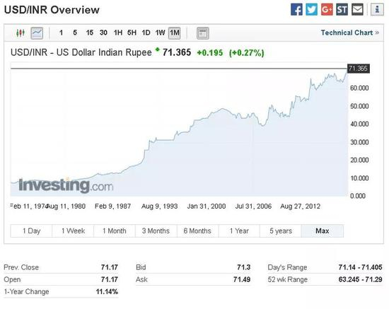 同样悲剧的还有印度,印度卢比兑美元一年以来贬值幅度亦超11%,周二汇率再刷历史新低至71.40。
