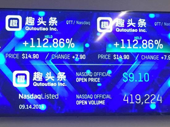 北京时间9月14日晚,被称为低配版“今日头条”的内容资讯平台趣头条在美国纳斯达克挂牌上市,盘中最高时一度飙涨190%,最终收盘报15.97美元,上涨128.14%,总市值一夜涨25.74亿美元至45.88亿美元,首日涨幅在今年美国500万美元以上IPO规模股票中创下新高。