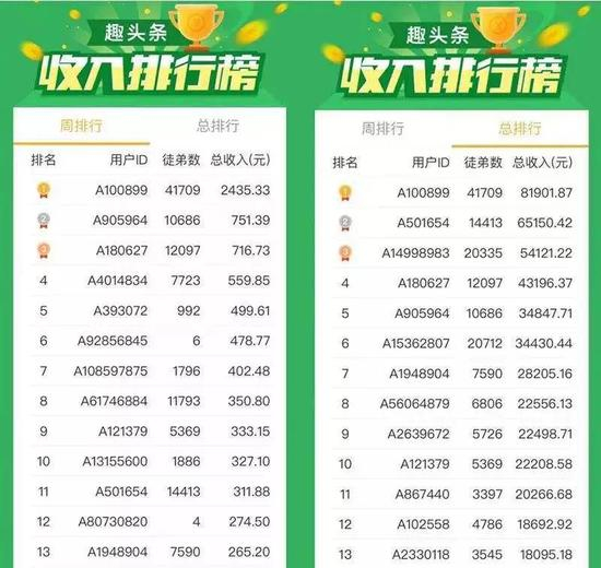 现金激励的获客途径,层层收徒的传销模式,借助微信等社交媒体,用户自发成为趣头条的传播者,主动帮助趣头条去唤醒沉默用户,让趣头条产生了指数级的裂变。趣头条自己津津乐道的那个案例是,排行榜榜首的用户收了4万个徒弟,获得了8万多的推广奖励。