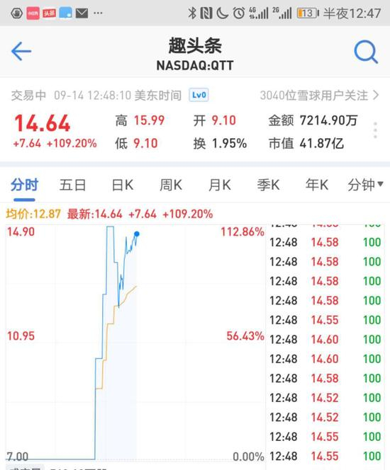 伴随着蔚来汽车开盘后过山车式的股价波动,刚刚在纳斯达克挂上一个名头的趣头条表现得太过耀眼:开盘涨32%,两分钟后涨幅48.86%暂停交易,十分钟后恢复交易涨幅又不断扩大至80%再次停牌。截止北京时间00:47分,趣头条的涨幅高至109.20%,说它是全场今日最佳MVP,估计也没人会反对。