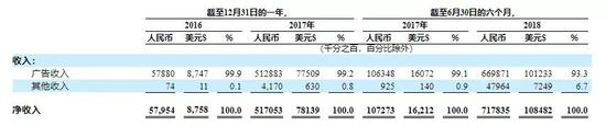 根据招股书,趣头条2018年上半年营收为7.178亿元(约1.085亿美元),而广告收入为6.69亿元(1.01亿美元),占比总营收93.2%。2017年同期营收为1.073亿元(约1620万美元),广告收入1.06亿元(约1607万美元),占比98.8%。