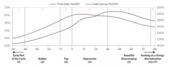 具体而言,这个模版是基于达利欧对48个大债务周期的观察,包含了所有导致GDP下挫3%的案例(即萧条)。达利欧提及,大型债务危机都可以分为六个阶段:周期早期、泡沫阶段、触顶、萧条、去杠杆以及正常化。