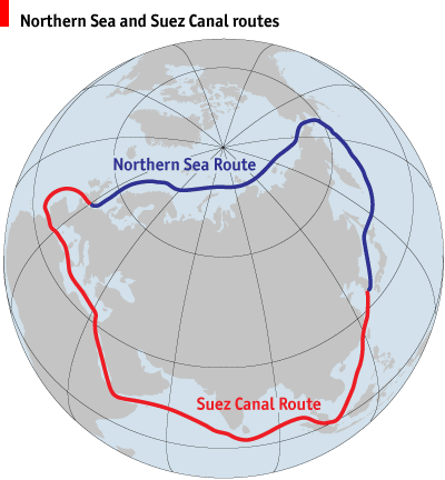 相较于传统的苏伊士运河航线,北极航线的开辟能够大大缩短从东亚到西欧的海运距离,可能为国际贸易节省大量成本。据估算,通过苏伊士运河从东亚到欧洲的航行距离为21000公里,而走北极航线这个距离将缩短至12800公里,航行时间缩短10至15天。