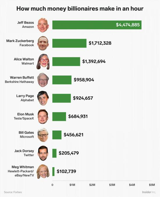 通过计算贝佐斯2017年和2018年净资产之间的差值(我们称之为年收入),然后将该数额除以8760(一年中的小时数)来估计他的时薪。贝佐斯的大部分财富都与亚马逊股票有关,估计他的时薪是为了做比较。