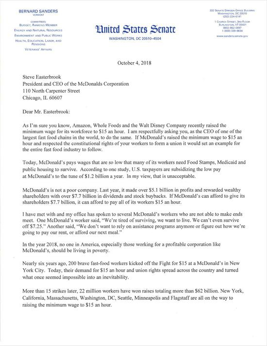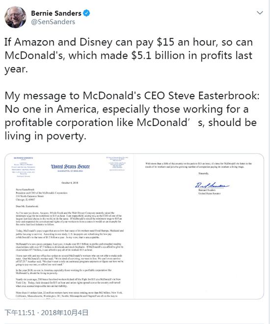佛蒙特州的参议员Bernie Sanders周四发布推特致函麦当劳的CEO,“如果亚马逊与迪士尼可以支付15美元的时薪,那么去年盈利51亿的麦当劳也可以。我对麦当劳CEO Steve Easterbrook的提醒是:像麦当劳这样的美国大型盈利公司,不应该有员工活在贫穷中。”