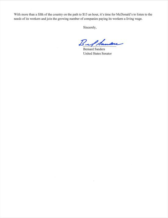 他在信函中表示,“如果麦当劳提高了最低时薪到15美元,并尊重员工的宪法权利让他们去成立工会,它将为整个快餐行业树立榜样,”