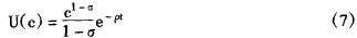 式中α为大于零和小于1 的正数。特别是,罗默假定劳动力的增长为零,并将劳动力总量单位化,从而上式中产出不再直接与劳动的贡献相联系。为寻求均衡增长条件,罗默引进了最优增长模型常用的指数型效用函数U(c):