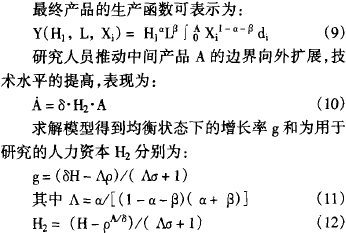 该模型的经济可分为三个部门:研究部门、中间品部门和最终品部门。有四种投入要素:有形资本Xi、非熟练劳动力L、人力资本H和技术水平A。人力资本指熟练劳动力,用受教育的时间来表示,人力资本水平在所有经济中是固定的,技术水平隐含在先前的创新产品之中。这样,知识由两部分组成:一是人力资本H,它具有竞争性;一是技术水平A,它是非竞争的,可实现无限的增长。模型假定人口是固定的,人力资本H用于最终品生产H1和新知识的生产H2(研究),则有H= H1 + H2。