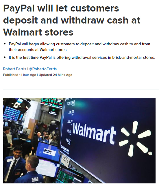 新浪美股讯 据CNBC消息,Paypal与沃尔玛周四表示,Paypal将开始在沃尔玛商店提供存款和取款服务。