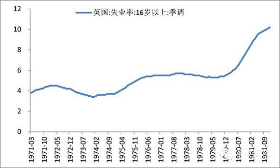 70年代,英国遭遇了长达10年的高失业率与高通胀共存的“滞胀”现象。外部因素如石油危机引起的油价飞涨,固然是英国高通胀的重要原因之一,但其内部因素更加重要。面对经济低迷,英国政府采取凯恩斯的需求刺激政策,财政和货币政策双宽松,变相债务货币化,致使通胀不断攀升。另外,英国工会滥用劳资谈判的权力,过度追求工资增长,导致英国工资水平与通货膨胀间的螺旋式上涨。1974-1980年间,英国GDP增长率平均只有1.0%,而通货膨胀率平均达到15.9%。同时,英国的失业率却不断攀升,从70年代初的3.8%上升至70年代末的5.5%,80年代初更是攀升至11.9%,致使经济深陷滞胀泥潭。