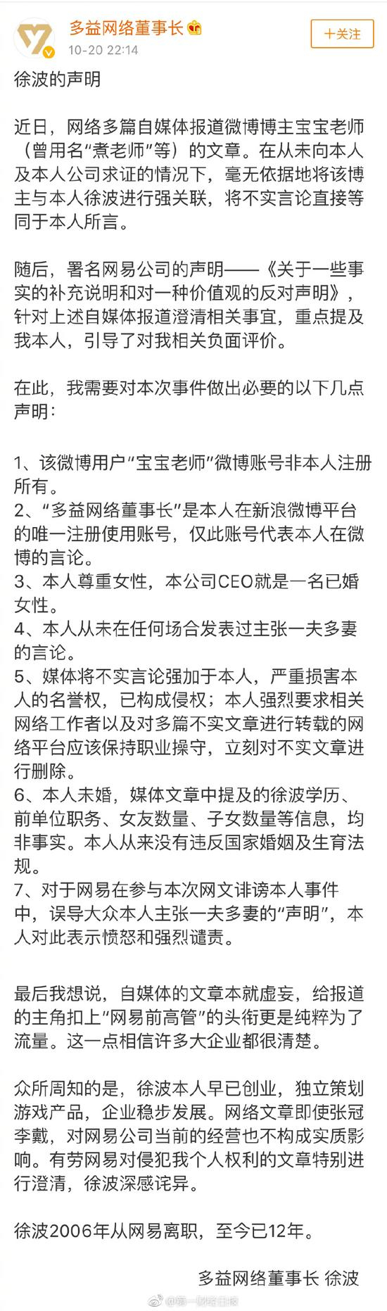 北京时间10月20日晚间消息,多益网络董事长徐波在微博发布声明,称“煮肘”(现名为“宝宝老师”)并非本人账号,自己从未违反国家及生育法规,并对“网易参与本次网文诽谤本人事件,表示愤怒与强烈谴责”。