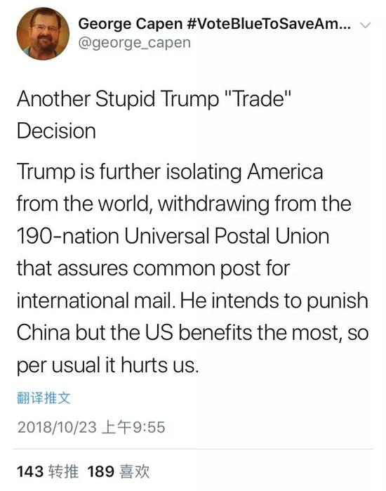 又是一个愚蠢的“贸易”决定。特朗普正进一步让美国与世隔绝,要退出涵盖190个国家、确保国际邮政业务的万国邮政联盟。他本打算惩罚中国,但其实美国受益最多,所以每次伤害的都是我们自己。