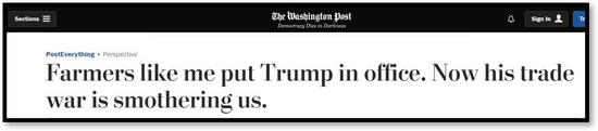 密苏里州的一位第五代牧场主卡莲娜·布鲁斯(Kalena Bruce)在华盛顿邮报发表了一篇文章吐槽经贸摩擦:是我们农民让特朗普当上了总统,可现在他的经贸政策快让我们窒息了。