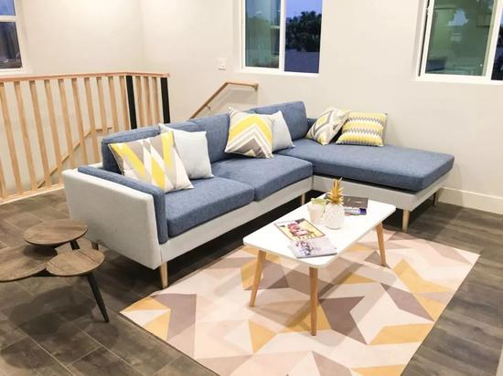 相比邻客优居,邻客寓具有更多的“定制”化特征。比如结合租客数据,对室内色调选择、空间利用、采光和家具选择等进行专门的设计。如下图所示,留学生以二十多岁的年轻人为主,他们对黄蓝色主调的小清新风格很有好感,这个在楼梯口处的带沙发小客厅,也最大化利用了有限空间来提供公共休息和娱乐场所。