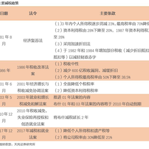 最近的减税是2017年底通过的《减税与就业法案》(Tax Cuts and Jobs Act of2017)。该法案对个人所得税税率、企业税率以及税收抵扣和减免等方面都做出了重大改革,在未来10年内将使联邦政府减少5.8万亿美元收入,年均政府收入减少规模为GDP的2.5%,是里根减税以来的最大减税计划。