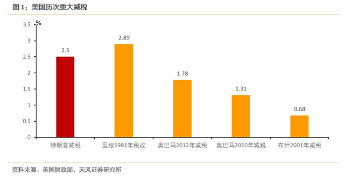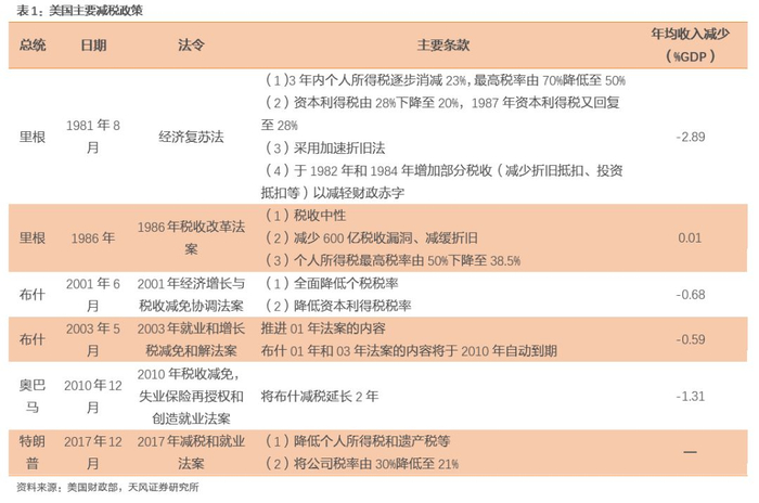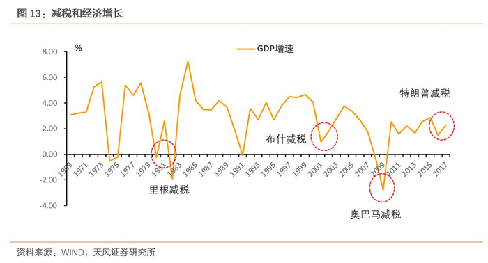 从减税目的看:美国减税主要是为了促进经济增长(里根减税、奥巴马减税,特朗普减税),同时解决经济的结构化矛盾(里根:滞涨;特朗普:制造业外流),布什时期主要是预算盈余持续增加对于减税的倒逼。
