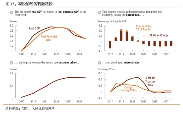 总结来看,短期内,机构普遍认为减税将刺激经济,对刺激幅度的看法有所偏差,机构对近期(2018-2022五年平均)减税刺激效果的预期,分布在0.3-0.9个百分点之间。主要刺激渠道可能是促进企业投资,进一步拉动需求,对生产率的提升较小。根据CBO的看法,刺激效果的拐点主要看利率:应当关注通胀和利率上行对减税效果的压抑作用。