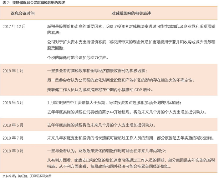 从联储表述看,减税对个人消费支出的促进是确定性的。对投资的看法有所分化,随着时间推进,减税的刺激作用将逐渐减小。