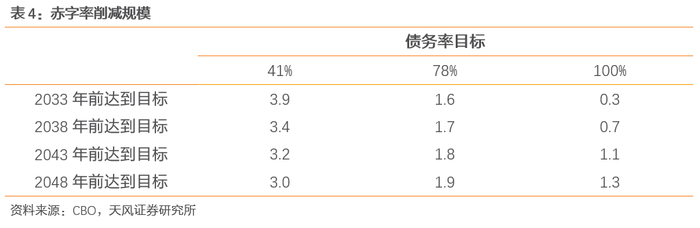 国会预算办公室计算了达到不同债务率目标时,联邦政府需要削减的赤字率规模。预算办公室考虑了三种债务率目标,41%(过去50年的平均债务率),78%(当前债务率)以及100%的债务率水平。