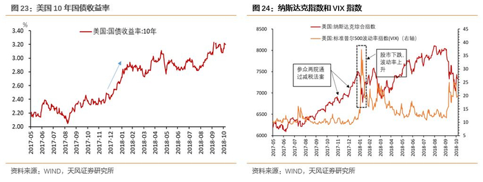 资本市场在税收法案讨论时期就持续上涨,主要反映了对企业盈利增加的乐观预期。自12月22日特朗普签署法案,至2018年1月30日,纳斯达克累积上涨7%。与此同时,市场也担忧减税促使经济过热,从而加剧通胀;另外,减税可能促使美联储坚定加息步伐。因而,减税法案通过后,美债收益率也持续上升。1月低,市场对过热的担忧达到顶峰,叠加美债收益率创新高(接近3%),股指下跌同时波动率上升,纳指回调接近4%。