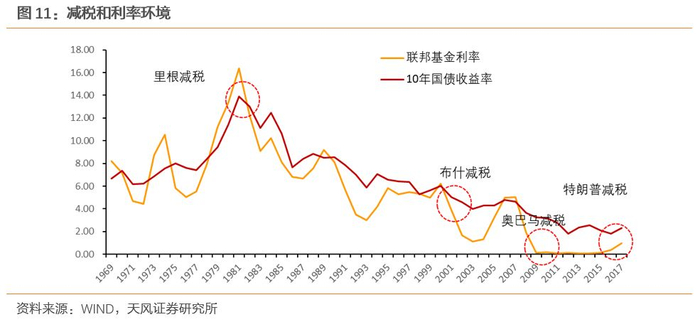 从利率水平来看,历次减税时美国多处于货币政策宽松期,债务杠杆约束宽松。