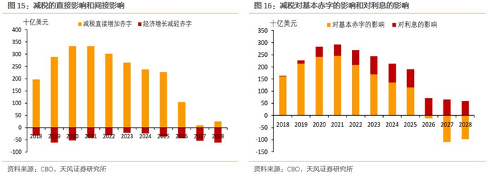但减税对利息支出影响的持续性更强:减税将导致存量债务的持续增加,因此利息支出将逐年增加。