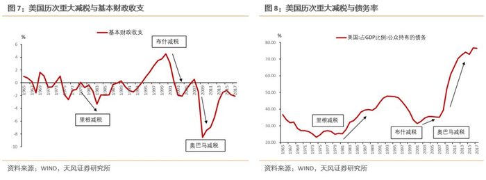 在里根减税前,由于石油危机冲击,美国处于滞涨时期,经济增长下行,通胀上行,二者均意味着财政空间的收敛;在布什减税时期,受科技泡沫破裂影响,经济增长率下行;奥巴马减税时期,次贷危机后美国经济增长率也出现断崖下降。