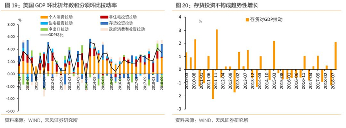 2018年以来,美国经济确实保持复苏势头,但主要贡献仍然是个人消费支出。税改对2018年1-2季度的投资刺激比较明显,但持续性不足。三季度美国投资继续增长,主要依靠存货投资构成增量贡献,并不构成趋势性支撑,税改对企业投资刺激的持续性不强。