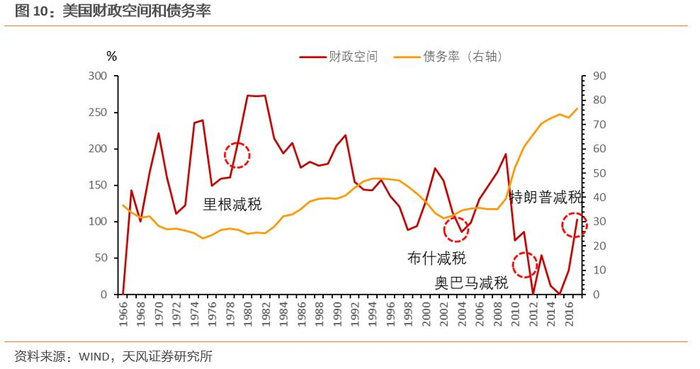 我们按照IMF的方法对美国财政空间进行了计算,发现里根减税和布什减税时,美国财政空间都相对宽裕或处在上升期,奥巴马减税时期是个例外,在布什减税后美国债务率持续上升,财政空间相对逼仄。但特朗普减税时美国债务率企稳,财政空间重又上升。