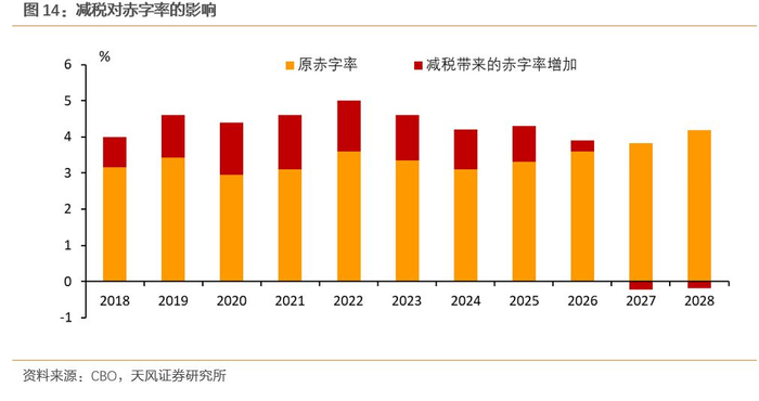 根据CBO的预测,减税后赤字率年度增加幅度在2021年达到顶峰,约为1.5个百分点,随后影响逐年下降。