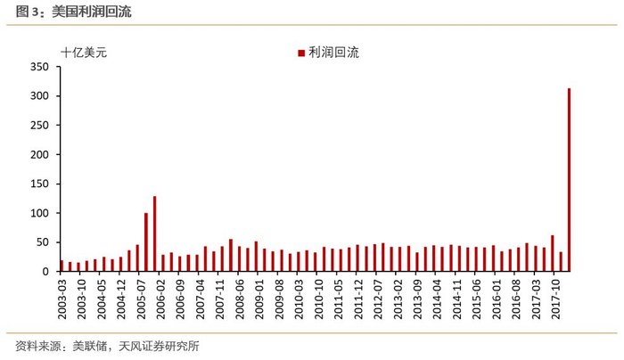 美国企业存在大量海外利润留存,为鼓励利润回流,税改将汇回税税率设定为14.5%,这一优惠税率远低于企业所得税税率。根据美联储测算,税改后美国海外利润汇回由每季度百亿美元量级激增至2018年1季度的3000亿美元。