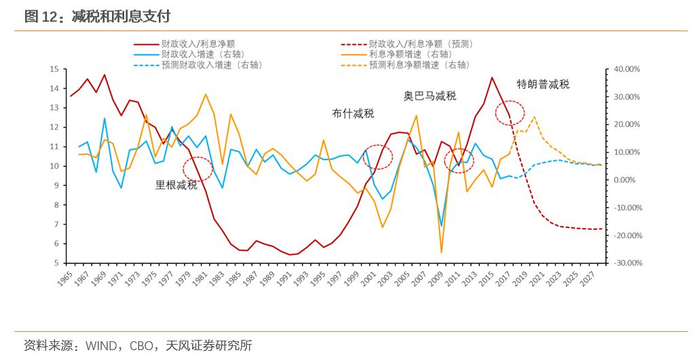 本轮特朗普减税与前几轮减税不同,美联储进入加息周期,利率上升对财政空间有所冲击,但利率环境并非影响债务偿还压力的唯一因素,我们还可以用财政收入/利息净额直接观察利息偿付压力。