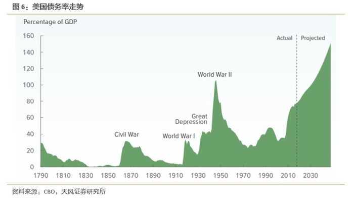 美国当前的债务率是78%,根据美国国会预算办公室(CBO,CongressionalBudget Office)的计算,在现行财政收支情况下,美国联邦债务率将在未来30年内迅速上升:在10年内达到100%;并在2048年达到152%。