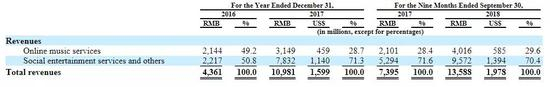 QQ音乐与CMC合并之后,腾讯音乐的整个收入中,Social entertainment services and others这项占2018年前九个月的总收入的70.4%。而这个Social entertainment services and others主要包括通过直播服务、在线K歌、音乐衍生品和其他获得的收入,可以预见,直播服务仍然贡献了腾讯音乐的大部分收入。