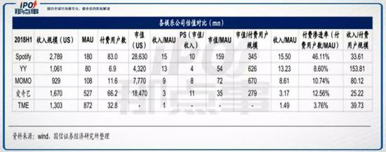 腾讯音乐直接对标的是在美国上市的Spotify,Spotify最新的市值是253亿美元,与腾讯这次招股后的市值接近。这个是国信证券以2018年半年业绩做的一个比较,我们可以看到,腾讯音乐的每月活收入和付费渗透率都是显著低于其他公司的,其中的逻辑在之前有提到过。但其每付费用户的收入却不低,甚至还高于了Spotify,可以看出,腾讯音乐的变现能力还是很强的。