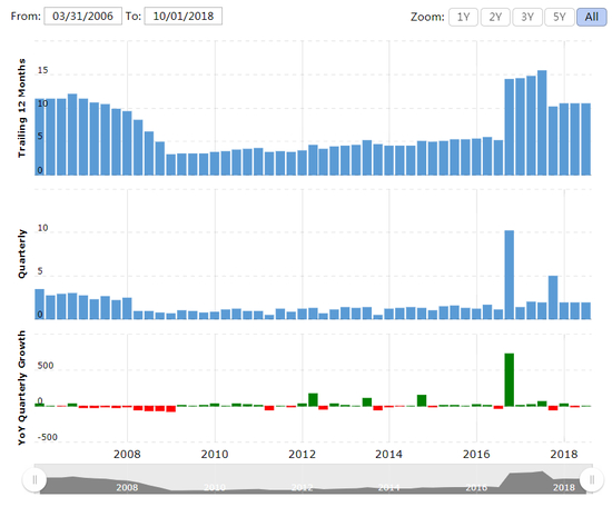 由于纸质烟的辉煌逐渐暗淡,奥驰亚今年以来的股价大幅下跌,迄今已跌去接近30%,尽管跌幅略低于整个烟草板块。2017财年,这家公司归属于母公司的净利润同比大跌近30%。下图是该公司净利润的变化: