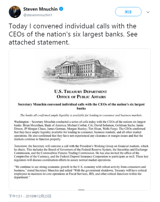 前一天、美东时间23日上周日,姆努钦在个人社交账户上发布声明证实,当天他已向包括高盛、摩根大通、富国银行在内的美国六大行一把手纷纷致电,询问有关市场流动性的问题,以期提振人们对美国金融体系的信心。