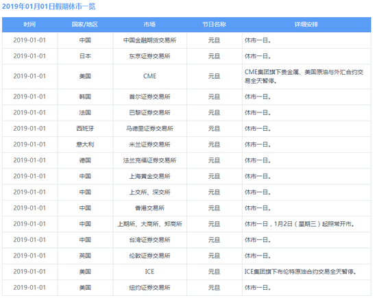 美国及全球主要交易所元旦(1月1日)休市