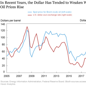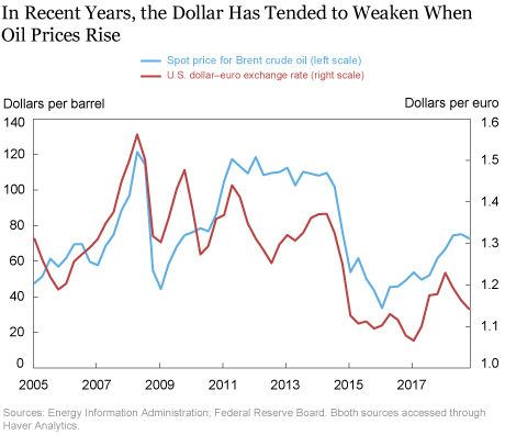 纽约联储经济学家观察发现,油价与美元兑欧元的反向运行格局在2005年左右开始显现,这种相关性在2006-2010年和2014-2018年期间尤为明显。