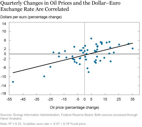 纽约联储经济学家将上述数据转化为百分比变化,利用为线性回归以量化这种相关性。计算回归系数发现,相关性大约为油价上涨10%、美元兑欧元同期跌1.5%。用R平方来衡量两者拟合效果,在2005年至2018年期间,以季度来看,油价变动可以解释33%的美元兑欧元汇率变动。