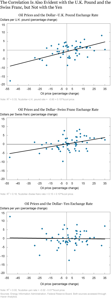 再看美元兑其他货币与油价的相关性。纽约联储经济学家用同样方法研究发现,油价与美元兑英镑汇率呈现出同样强烈的负相关性,与美元兑瑞士法郎汇率之间的关系也较为强劲,但是与美元兑日元汇率则看起来毫无关联。也就是说,这种相关性体现在美元兑欧洲货币,但不体现在美元兑其他货币上。